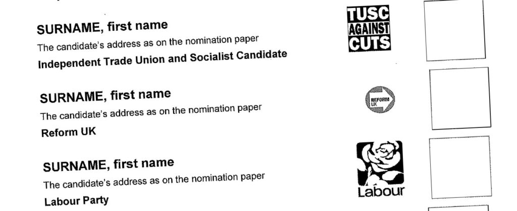Under Britain’s election laws, candidates are only allowed to use a description on the ballot paper next to their name other than the word ‘Independent’ if that description has been registered with the Electoral Commission by a recognised organisation like TUSC, the Trade Unionist and Socialist Coalition. TUSC has eight descriptions available to use, including for the first time the words, Independent Trade Union and Socialist Candidate.